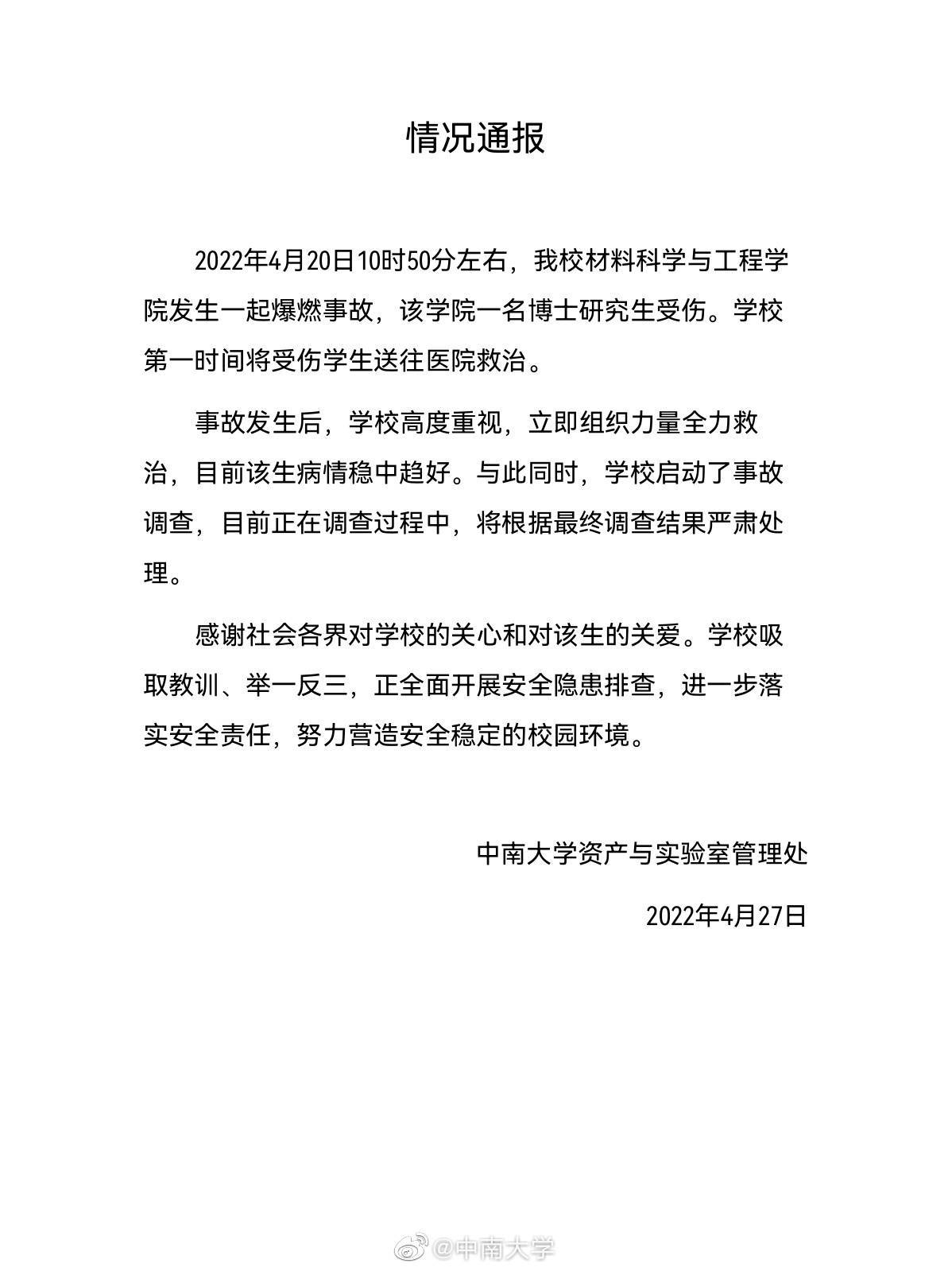 中南大学回应燃爆事故 :一名博士研究生受伤,启动事故调查