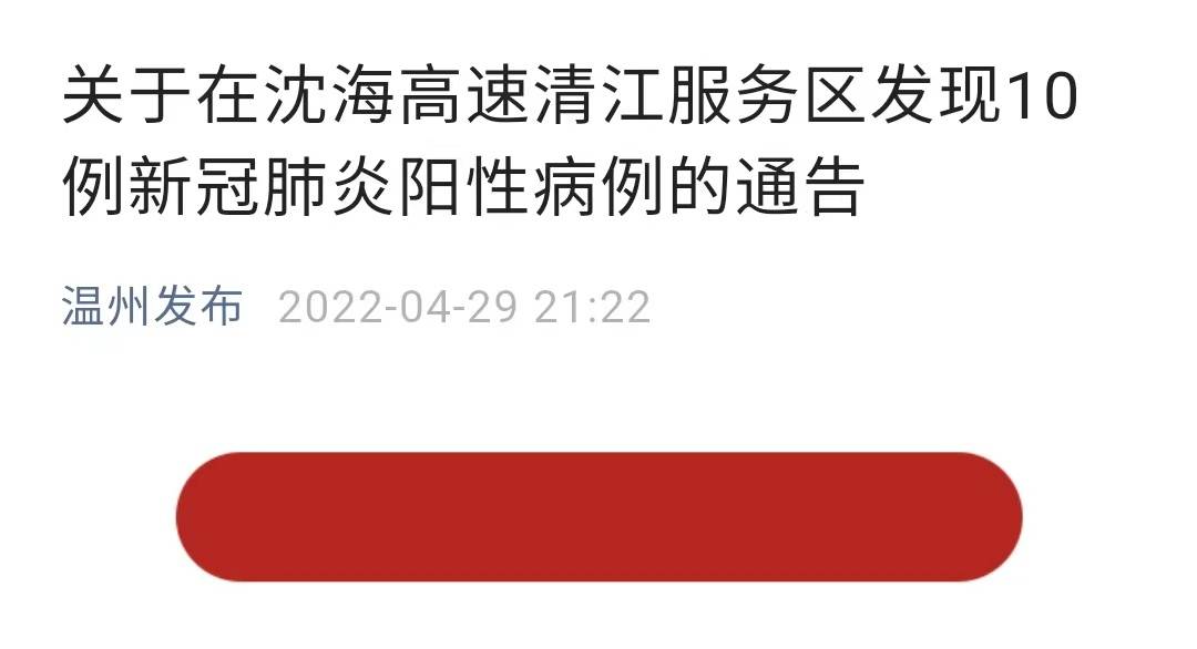 温州发布微信号4月29日晚间发布《关于在沈海高速清江服务区发现10例新冠肺炎阳性病例的通告》。