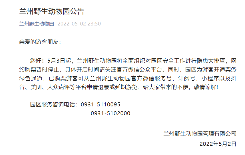 2日晚间,兰州野生动物园发布公告称,5月3日起,兰州野生动物园将全面组织对园区安全工作进行隐患大排查,网约购票暂时停止,具体开启时间请关注官方微信公众平台。同时,园区为游客开通票务绿色通道,已购票游客可从兰州野生动物园官方微信服务号、订阅号、小程序以及抖音、美团、大众点评等平台申请退票或延期游览。