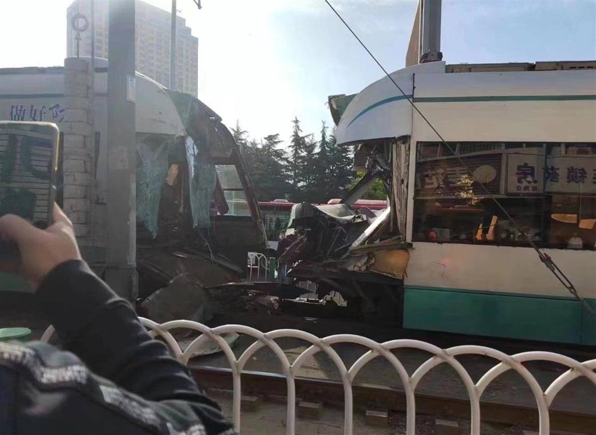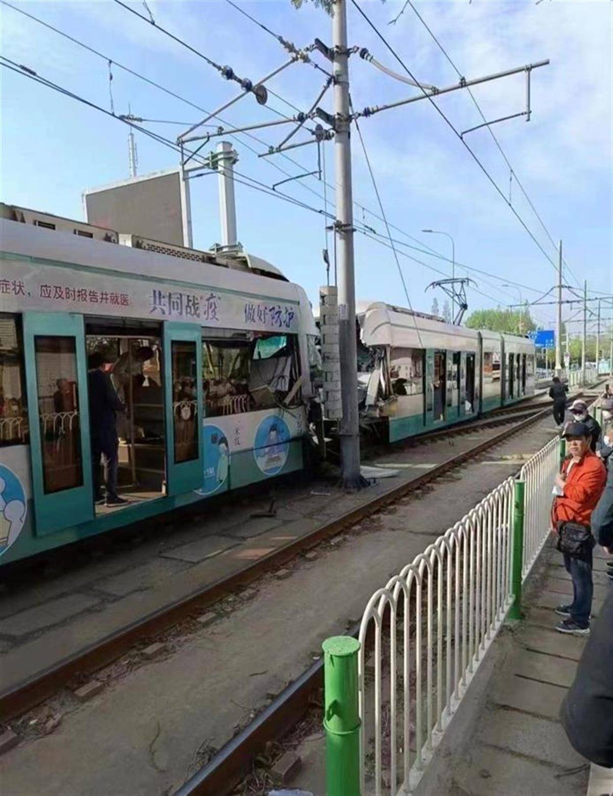 网上流传的视频和图片显示,两辆有轨电车停在轨道上,两辆车紧挨在一起,两车接触部分明显受损,有救援人员从一辆有轨电车内抬出一名受伤人员。