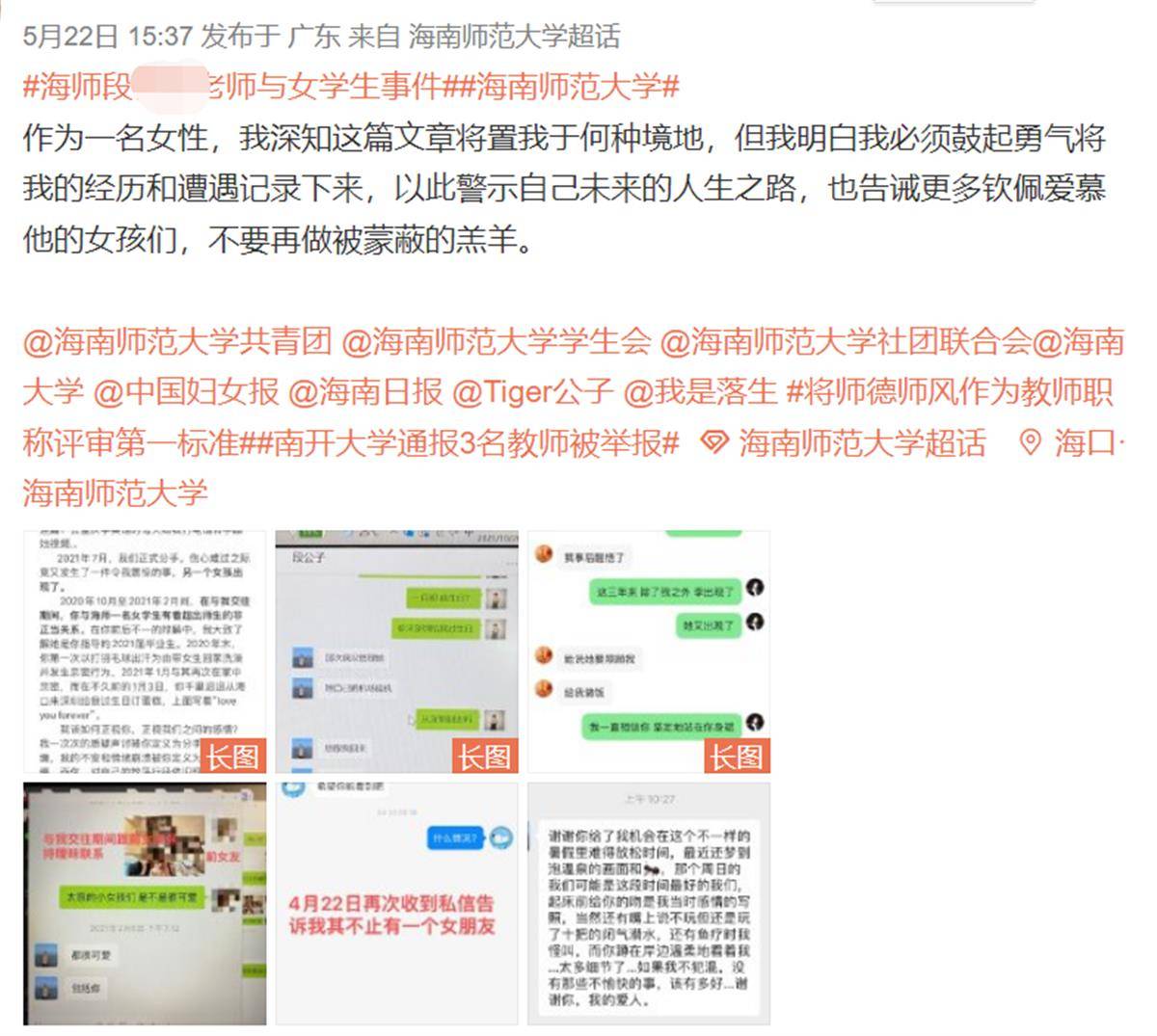 5月22日,网友钱女士(化姓)在社交平台发帖称,海南师范大学副教授段某某与她谈恋爱期间,还与其他多名女生存在非正当关系。