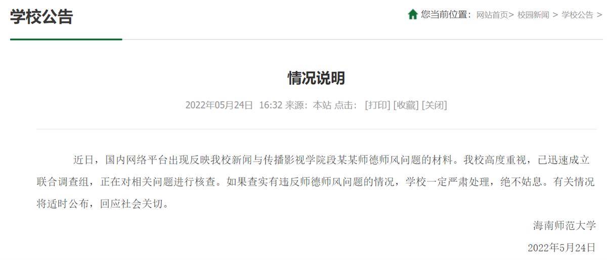 5月24日下午4时许,海南师范大学官网发布情况说明,称学校高度重视网上反映段某某师德师风问题的材料,已迅速成立联合调查组,正在对相关问题进行核查。如查实有违反师德师风问题的情况,学校一定严肃处理,绝不姑息。有关情况将适时公布,回应社会关切。