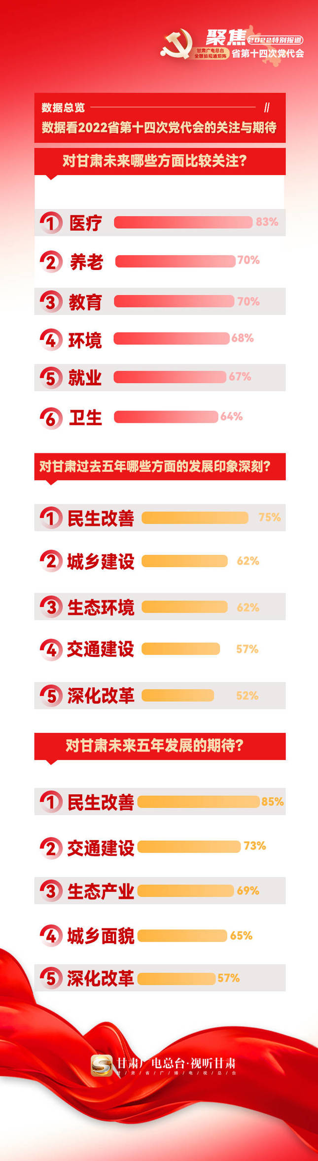 提建议,献良策,话发展。视听甘肃(丝路明珠网)在甘肃省委网信办的指导下,开展“我为党代会建一言”调查问卷征集活动。大家畅所欲言,涌现出了不少贴近民心、富有创意的“金点子”和发自肺腑的真知灼见,一条条涉及经济发展、乡村振兴、民生改善、精神文明、生态保护等多个领域的意见建议从基层一线、四面八方汇聚而来,为甘肃省第十四次党代会的胜利召开凝聚了广泛共识、增添了智慧力量。下面就带你一起细“数”核心数据,倾听民声看民意。