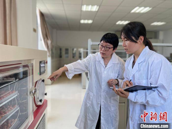 福州市蔬菜科研所所长陈秀娟(左)研究蔬菜水果冻干技术。 林春茵 摄