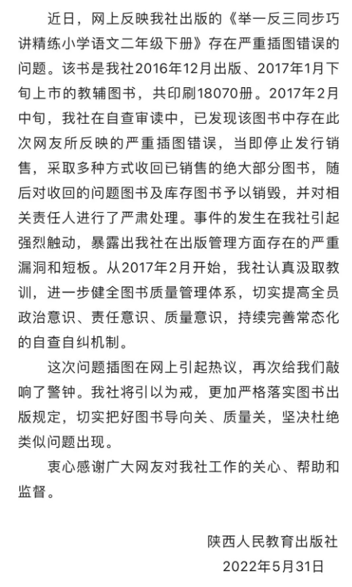 陕西人民教育出版社微信公众号31日发布《陕西人民教育出版社关于教辅图书插图问题的情况说明》:2017年,该社在自查审读中,已发现该图书存在的严重插图错误,当即停止发行销售,采取多种方式收回已销售的绝大部分图书,随后对收回的问题图书及库存图书予以销毁,并对相关责任人进行了严肃处理。