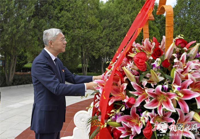 红军会宁会师旧址松柏苍翠、庄严肃穆,会师纪念塔巍然屹立。尹弘等在纪念塔前肃立,怀着无比崇敬的心情,向革命烈士敬献花篮。伴着雄浑低沉的《献花曲》,尹弘缓步上前,仔细整理缎带。随后,大家一起向革命先烈三鞠躬,并缓步绕行、瞻仰纪念塔,表达对革命先烈的深切缅怀。