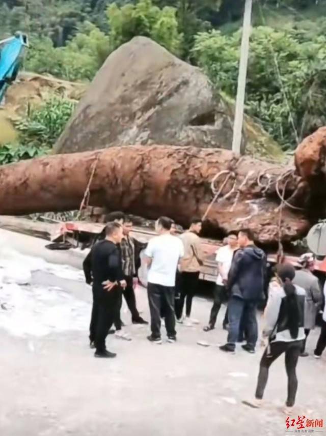 根据网友拍摄的视频显示,一根巨型的乌木被绑在货车上运走,目测长度至少10米以上,直径至少1米多,货车周围聚集了很多围观群众,有警车停在现场。有知情网友表示,这根乌木是上周在该县劳动镇珍珠桥村被发现的,这两天才完全挖了出来。