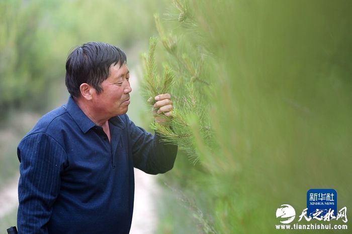5月25日,在高台村万亩苗林示范点,李文军查看苗木的成长情况。(新华社记者 陈斌 摄)
