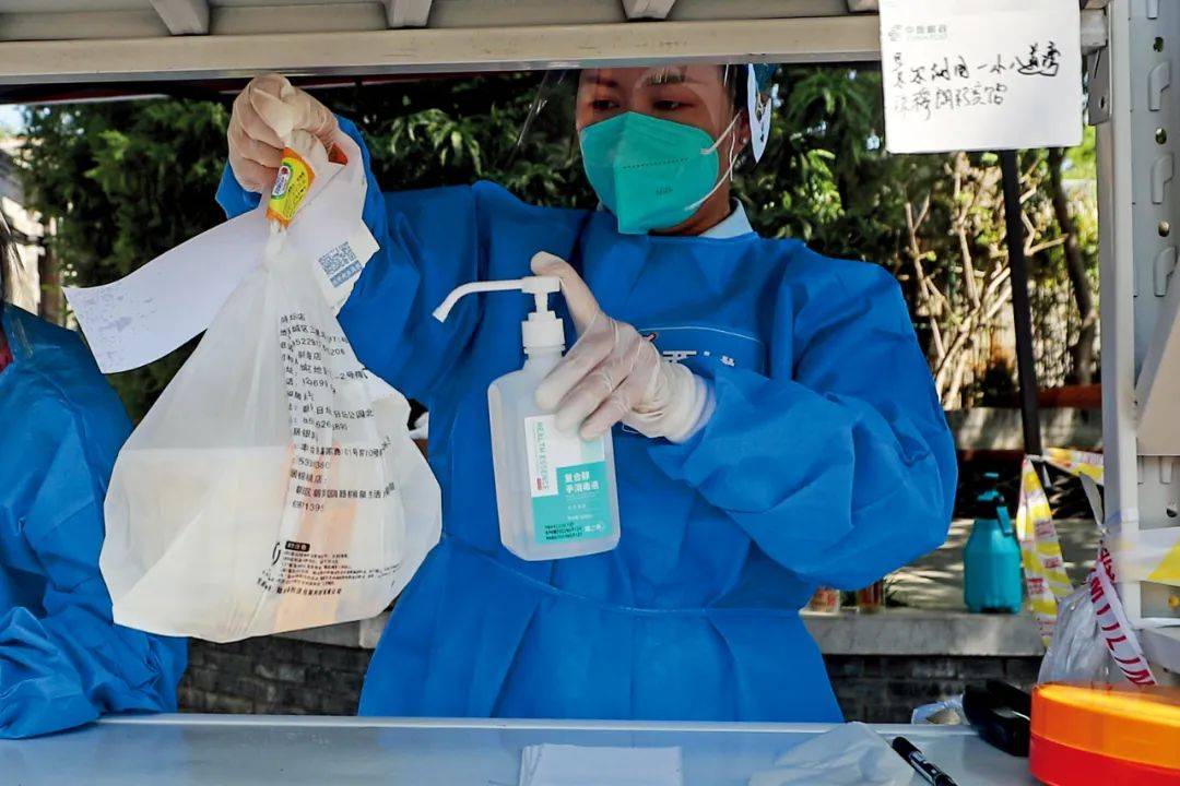 6月1日,北京市西城区鼓楼西大街相关区域因疫情采取封、管控措施,外卖快递车辆无法进入,地安门邮局在鼓楼西大街东口和西口设立快递中转站。社区志愿者接收物品后对外包装进行消杀。