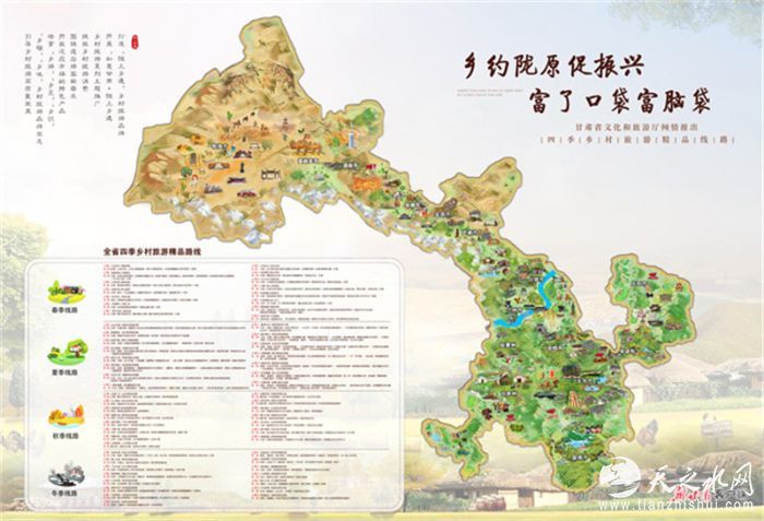 此次,省文旅厅设计印发的甘肃乡村旅游手绘图(2021版),以“相约陇原促振兴·富了口袋富脑袋”为主题,突出“图文并茂、服务游客、便于携带、适于珍藏”等特点,对2021年创建的8个乡村旅游示范县,60个文旅振兴乡村样板村全部开发设计了电子“二维码”,设置了甘肃省乡村旅游60条四季精品线路,以亮丽、活泼的色彩和卡通的形式,生动形象地展现了甘肃乡村旅游特色元素和资源产品信息。甘肃乡村旅游手绘图计划“十四五”时期连续推出5版,全方位、多角度涵盖展示甘肃乡村自然风光、风俗民情、历史风貌以及特色景区、地方美食、当地特产、精品线路、非遗文化等信息内容,最终打造出“陇上相遇”乡村旅游全景图。