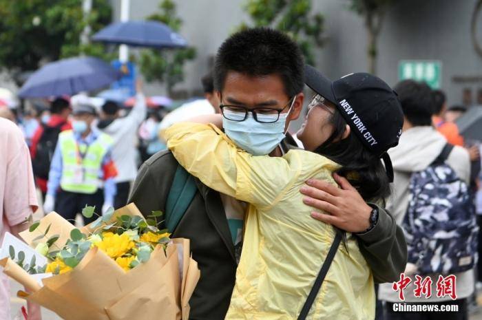 6月8日,一名考生在考点外与家长相拥。当日,云南省2022年高考落幕。 中新社记者 李嘉娴 摄
