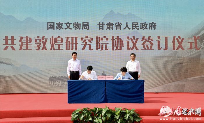 省委常委、兰州市委书记朱天舒主持。国家文物局副局长陆进与副省长何伟代表双方签署《国家文物局 甘肃省人民政府共建敦煌研究院协议》,与会领导见证签约并参观甘肃省博物馆有关展览。