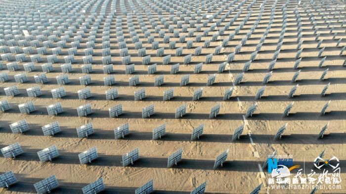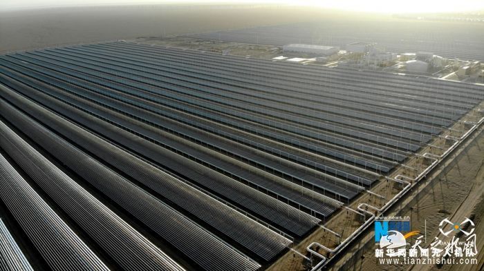 这是6月12日在甘肃省敦煌市光电产业园区拍摄的50兆瓦熔盐线性菲涅尔式光热发电示范项目。新华网发 (张晓亮 摄)