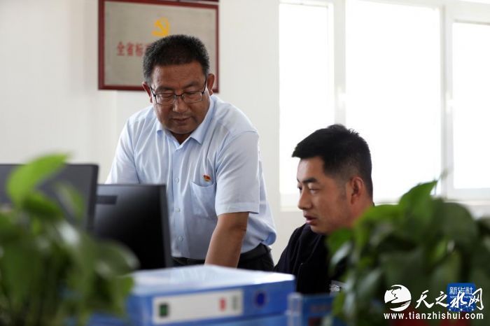 在甘肃省武威市古浪县黄花滩富民新村党群服务中心,富民新村党总支书记张延堂(左)和同事商讨工作(6月12日摄)。新华社记者 张智敏 摄