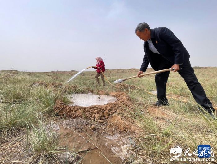 甘肃省武威市古浪县八步沙林场场长郭万刚(右)与林场职工为新种树苗浇水(5月6日摄)。新华社记者 郭刚 摄