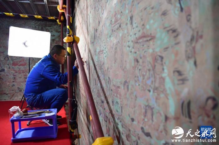 敦煌研究院文物保护技术服务中心壁画修复师杨金礼在莫高窟第231窟内修复出现病害的壁画(4月19日摄)。新华社记者 陈斌 摄