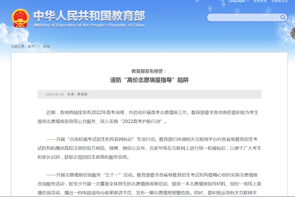近期,各地将陆续发布2022年高考成绩,并启动开展高考志愿填报工作。教育部6月23日发布预警,提醒广大考生和家长谨防“高价志愿填报指导”陷阱。