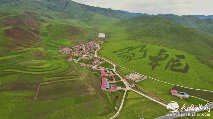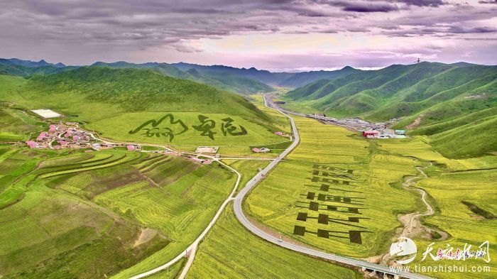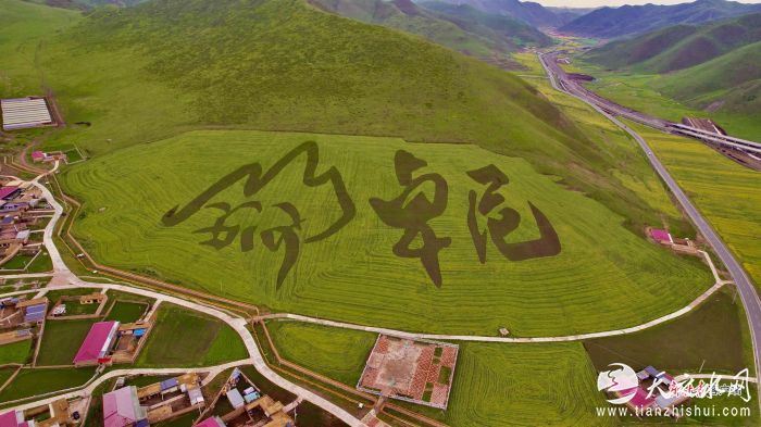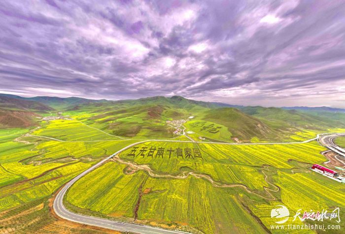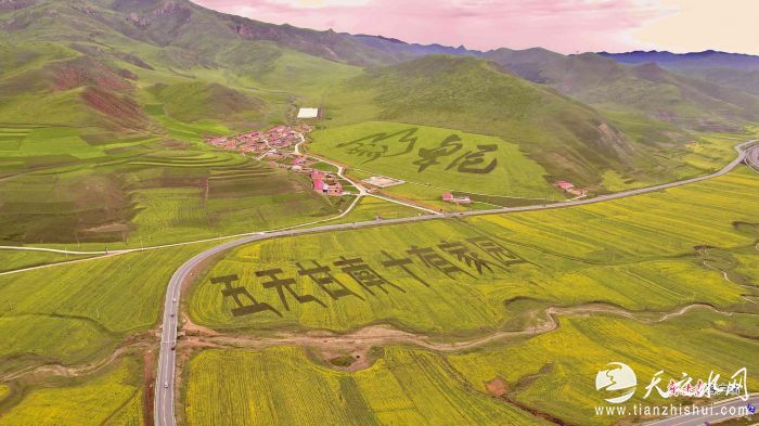 最近几天,不少自驾游途经S306省道的游客惊喜地发现,位于甘南州卓尼县完冒镇红山口附近的原野上,一幅以油菜为画布、绘着“五无甘南 十有家园”图案的“油菜画”匠心独具、别致震撼。