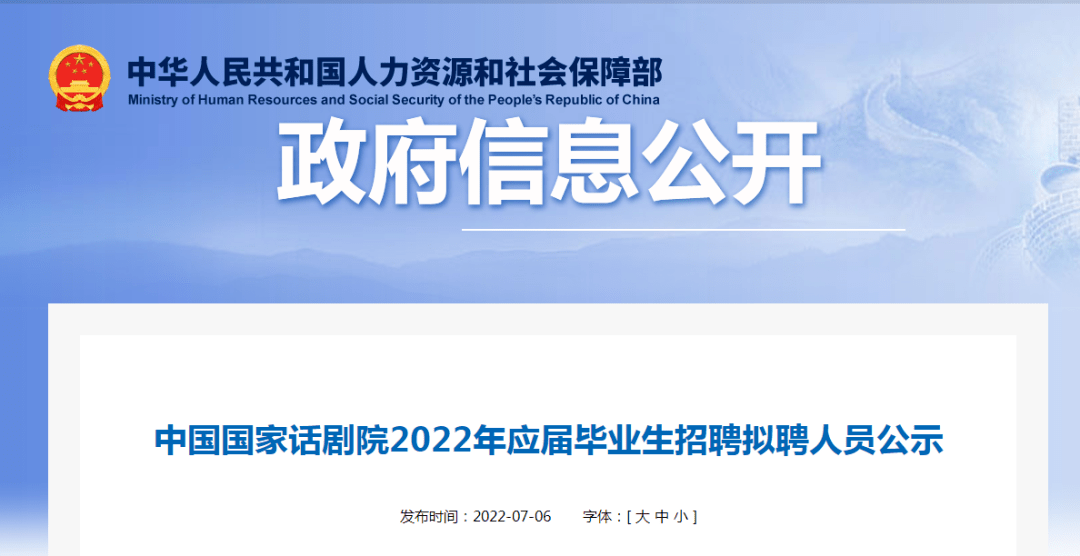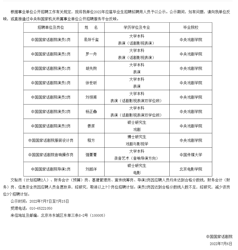 7月6日,人社部官网发布了《中国国家话剧院2022年应届毕业生招聘拟聘人员公示》。公告显示,共有10位应届毕业生成为中国国家话剧院“2022年应届毕业生招聘拟聘用人员”,其中8人来自中央戏剧学院,1人来自中国传媒大学,1人来自北京电影学院。一共包含7名本科生,2名硕士研究生和1名博士研究生。