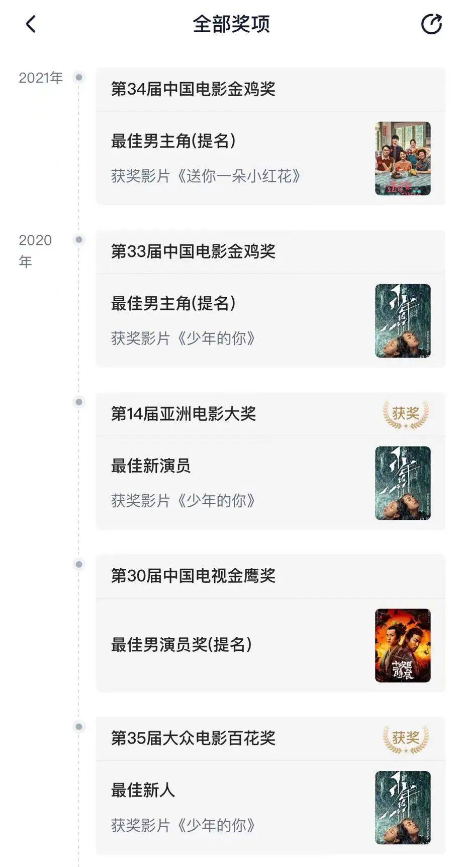 童星出道的易烊千玺,凭借偶像组合TFBOYS大火,高考考入中央戏剧学院表演专业,出演过《少年的你》、《送你一朵小红花》、《长津湖》、《长安十二时辰》等不少作品,凭借今年2月的春节档《长津湖之水门桥》《奇迹·笨小孩》两部电影的加持,易烊千玺主演的电影票房累计破100亿,他成功拿下“中国首位00后百亿票房男演员”的荣誉。他3次获奖,4次提名,其中2次提名金鸡奖最佳男主,1次提名金鹰奖最佳男演员。