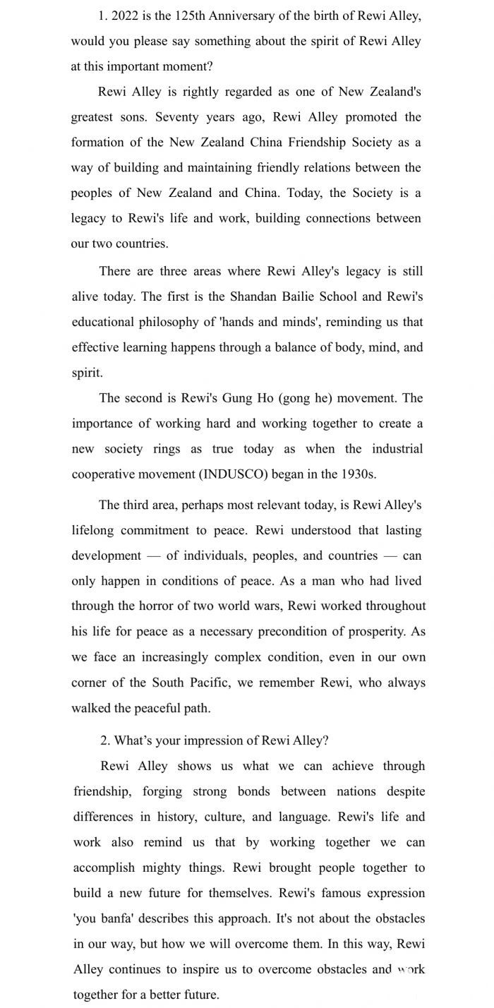 也是对今天最为重要的,就是艾黎终身致力于和平。艾黎认为无论对个体、人民还是国家来说,持续发展必须以和平为条件。作为经历过两次世界大战的人,艾黎终身为了和平而奋斗,因为他认为只有和平才能带来繁荣。我们现在面对的是日益复杂的环境,即使是在南太平洋的角落,我们仍然铭记着艾黎,一个永远走在和平大道上的人。