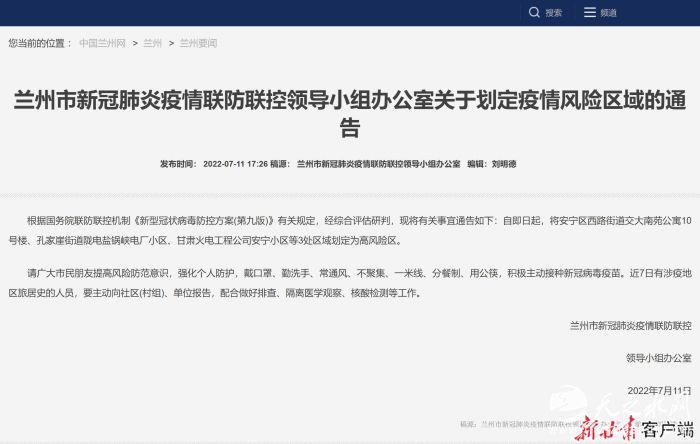 兰州市新冠肺炎疫情联防联控领导小组办公室根据国务院联防联控机制《新型冠状病毒防控方案(第九版)》有关规定,经综合评估研判,自即日起,将城关区盐场路街道九州幸福苑小区、城关区皋兰路街道六建家属院、城关区五泉街道和平新村19号火电公司家属院、城关区火车站街道金轮颐园小区6号楼、城关区铁路西村街道达祥南苑小区、城关区草场街街道香榭丽花园2号楼、城关区草场街街道3512西大院63号楼、城关区五泉街道五泉南路117号、城关区东岗街道兰泰小区院内48中学、城关区火车站街道铁路设计院小区、安宁区西路街道荣光崴廉公馆3号楼1单元、安宁区西路街道交大南苑公寓10号楼、孔家崖街道陇电盐锅峡电厂小区、甘肃火电工程公司安宁小区、永登县红城华山村2社划定为高风险区。
