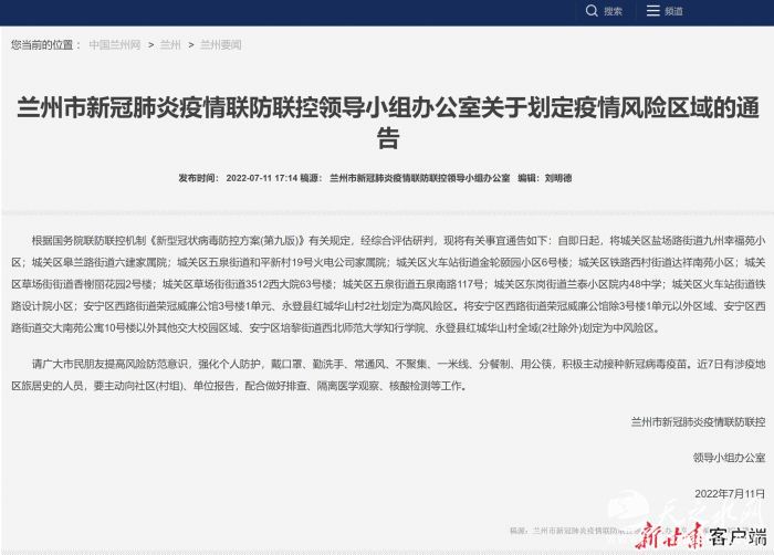 新甘肃客户端兰州7月11日讯(新甘肃·甘肃日报记者 薛砚)今天下午,兰州市新冠肺炎疫情联防联控领导小组办公室发布两则《关于划定疫情风险区域的通告》,新增15处高风险区及4处中风险区。