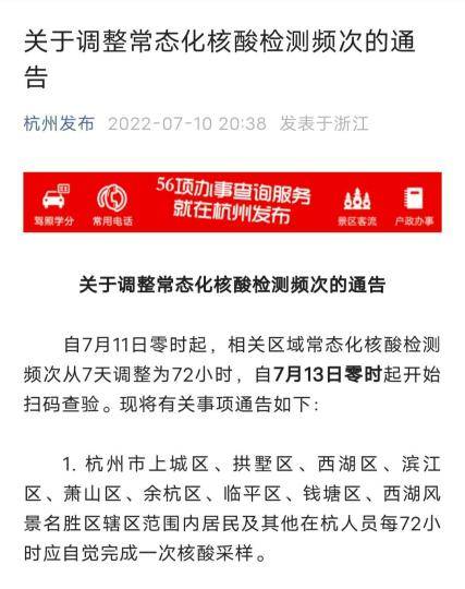 杭州调整常态化核酸检测频次。杭州市新型冠状病毒肺炎疫情防控工作领导小组办公室10日发布通告,自7月11日0时起,该市相关区域常态化核酸检测频次从7天调整为72小时,自7月13日0时起开始扫码查验。