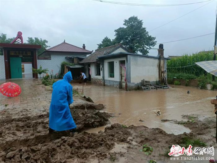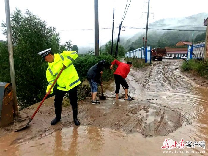 公安交警帮助群众清理淤泥。