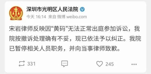 律师因“黄码”无法出庭被撤诉?法院致歉:已暂停相关人员职务 2022-07-18 10:00 南方都市报 我要评论0 律师因“黄码”无法出庭被撤诉?法院致歉:已暂停相关人员职务 7月17日,深圳市光明区人民法院发布通报称,宋岩律师反映因“黄码”无法正常出庭参加诉讼,该院按撤诉处理确有不妥,现已依法予以纠正。 据介绍,该院已暂停相关人员职务,并向当事律师致歉。 微笑 流汗 难过 羡慕 愤怒 流泪 责任编辑:王兰兰 复制网址 打印 收藏 0