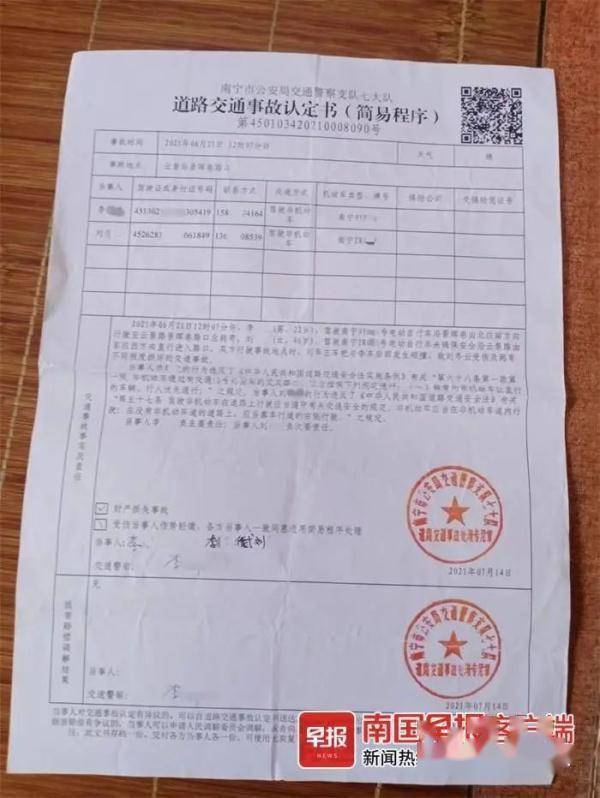 2021年7月14日,南宁市公安局交通警察支队七大队发出《道路交通事故认定书(简易程序)》,认定骑手小李负主要责任,刘女士负次要责任。