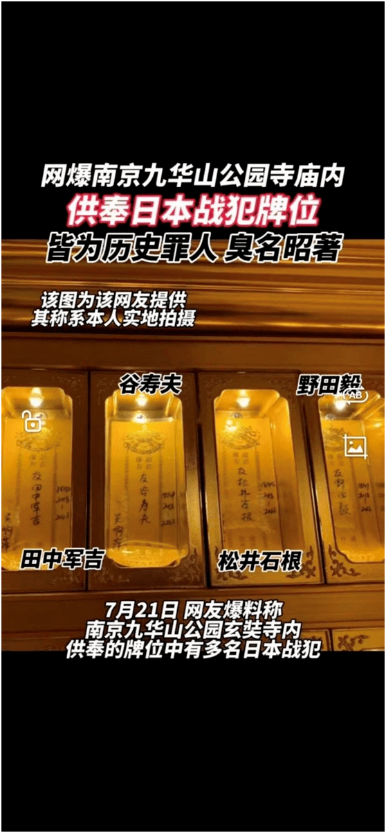 昨天18点55分,一位网友有图有真相地揭示,南京九华山公园内玄奘寺里竟然供奉着多位侵华日军战犯。