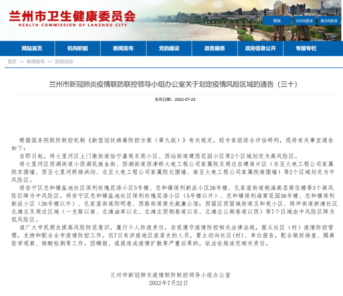 据兰州卫健委网站7月23日消息,根据国务院联防联控机制《新型冠状病毒防控方案(第九版)》有关规定,经专家组综合评估研判,现将有关事宜通告如下: