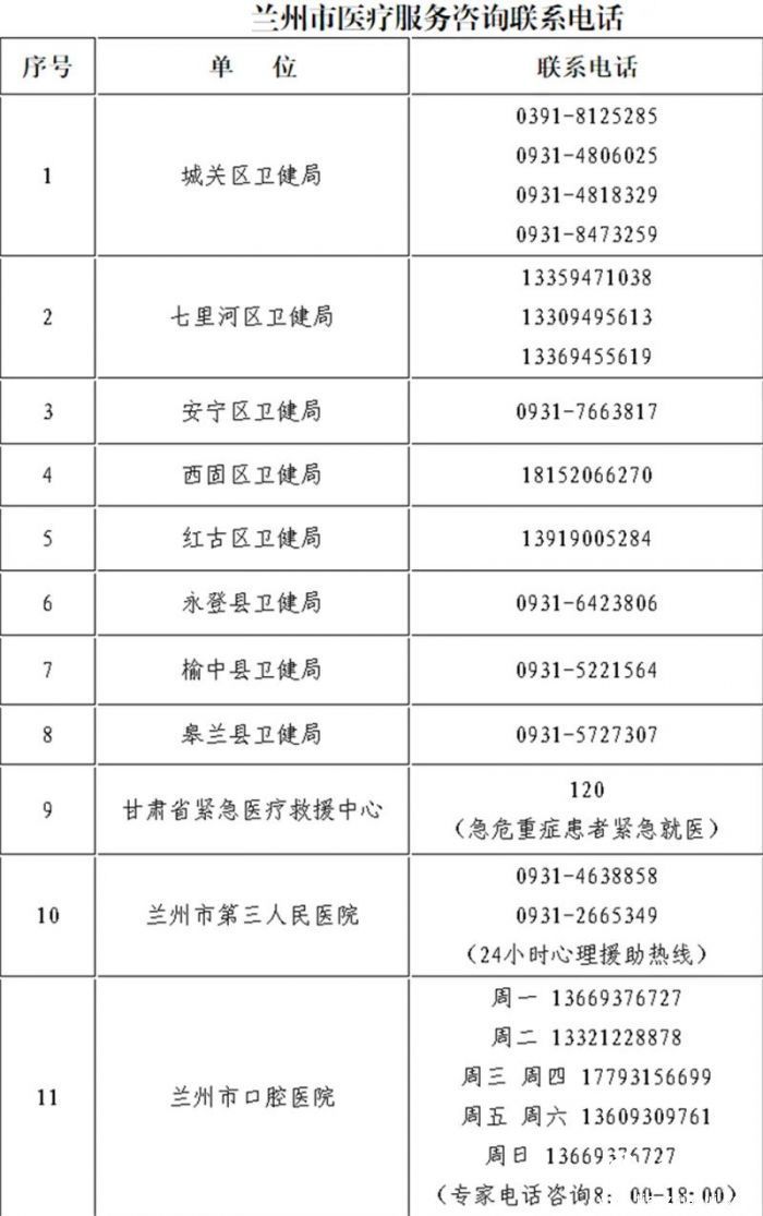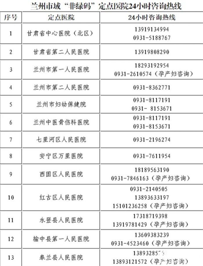 兰州市域疫情防控期间群众就医服务24小时咨询热线 2022-07-25 21:04 兰州市卫生健康委员会 我要评论0 为进一步做好我市疫情防控期间“非绿码”患者的医疗救治工作,满足群众日常医疗服务需求,现动态更新兰州市域疫情防控期间“非绿码”定点医院24小时咨询热线、医疗服务咨询联系电话并公布如下: 微笑 流汗 难过 羡慕 愤怒 流泪 复制网址 打印 收藏 0