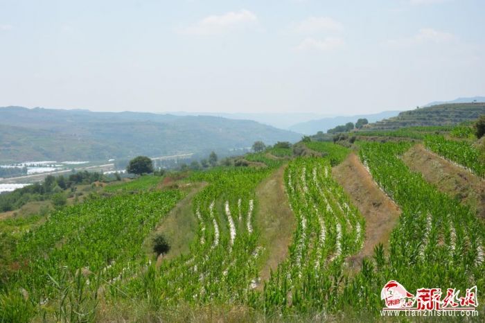 7月20日,记者一行沿着蜿蜒产业路行至松树村山顶处,放眼望去,连片玉米田在阳光下绿意盎然,个别玉米已开始拔节抽穗。