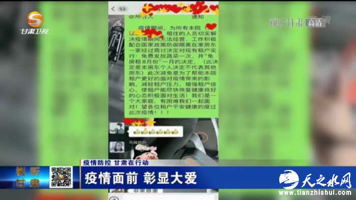 这份截图是兰州市城关区雁园街道的居民宋娇娇发在她租户群里的消息,群里一共有22家租户,有环卫工人、出租车司机,还有部分个体经商户。受疫情影响,这些租户响应号召,居家抗疫,宋娇娇就给每家租户减免了一个月的房租水电。