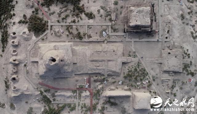 王建军说,塔尔寺遗址位于锁阳城城址东部约1.5公里处,外围院落内面积约2.2万平方米,内院现存大塔1座,小塔9座。塔群前曾有大型殿堂遗址,殿堂东西两侧保存了鼓楼及钟楼台基各1座,僧房数间。塔尔寺遗址还出土了瓦当、陶质兽角、佛首、木质斗拱、壁画残块、塑像残块等各类器物残件100余件。