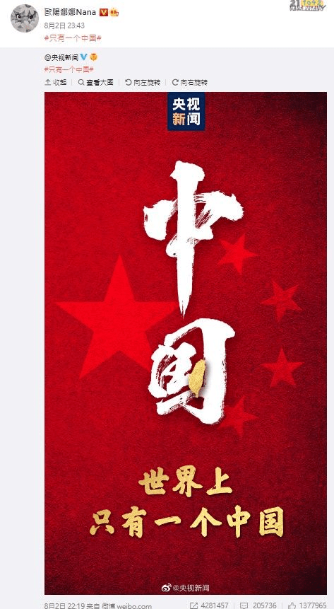 港台一众艺人表态“只有一个中国”,包括欧阳娜娜、王大陆、谢霆锋等