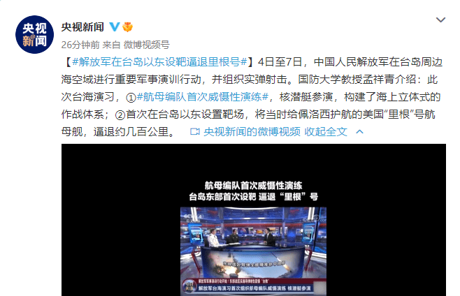 4日至7日,中国人民解放军在台岛周边海空域进行重要军事演训行动,并组织实弹射击。国防大学教授孟祥青介绍:此次台海演习,①航母编队首次威慑性演练,核潜艇参演,构建了海上立体式的作战体系;②首次在台岛以东设置靶场,将当时给佩洛西护航的美国“里根”号航母舰,逼退约几百公里。