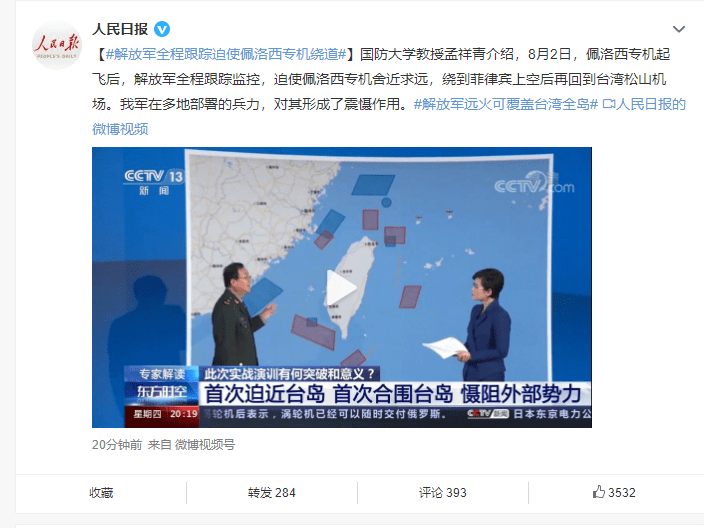 国防大学教授:解放军全程跟踪迫使佩洛西专机绕道 2022-08-05 10:18 人民日报 我要评论0 国防大学教授:解放军全程跟踪迫使佩洛西专机绕道 国防大学教授孟祥青介绍,8月2日,佩洛西专机起飞后,解放军全程跟踪监控,迫使佩洛西专机舍近求远,绕到菲律宾上空后再回到台湾松山机场。我军在多地部署的兵力,对其形成了震慑作用。 微笑 流汗 难过 羡慕 愤怒 流泪 责任编辑:王兰兰 复制网址 打印 收藏 0