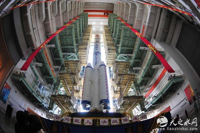 2013年6月3日,神舟十号飞船、长征二F遥十火箭组合体,从酒泉卫星发射中心载人航天发射场技术区垂直转运至发射区。新华社发(梁杰 摄)