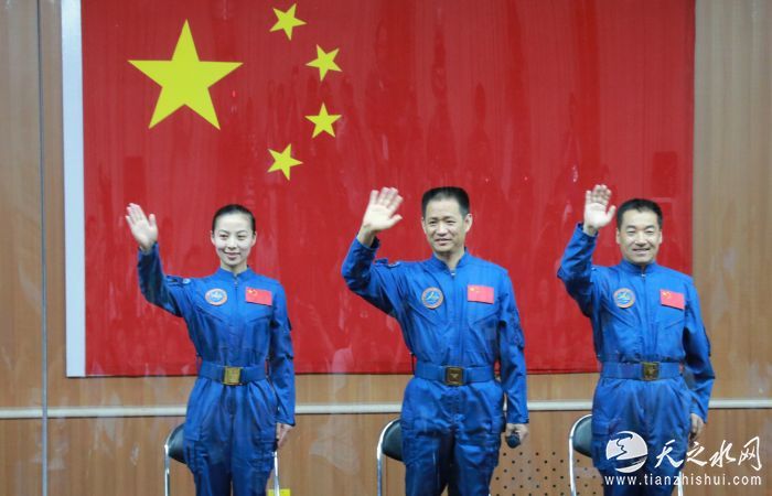 2013年6月10日,天宫一号与神舟十号载人飞行任务航天员在酒泉卫星发射中心同记者见面。新华社记者 李刚 摄