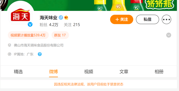 记者发现,目前,海天味业与海天酱油官方微博均处于禁言状态,禁言原因是违反相关法律法规。