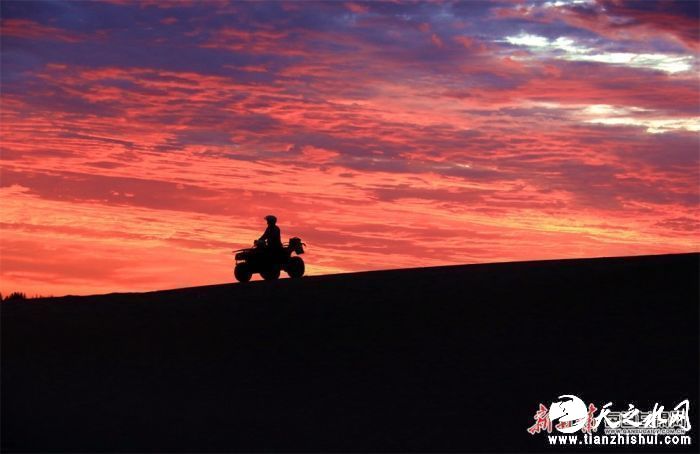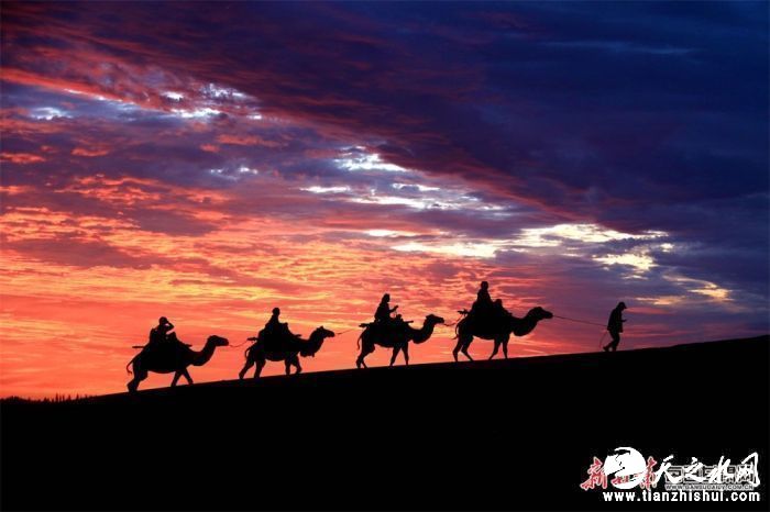 8月7日清晨,雨后的敦煌市鸣沙山月牙泉景区朝霞满天,景色迷人,游客在朝霞的陪伴下欣赏大漠如画风光。