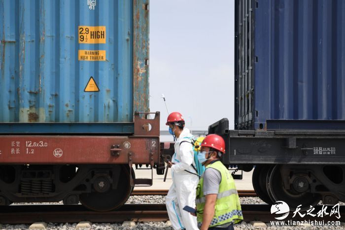 8月11日,在兰州新区中川北站物流园,工作人员对刚刚抵达的国际货运班列进行消杀。新华社记者 陈斌 摄