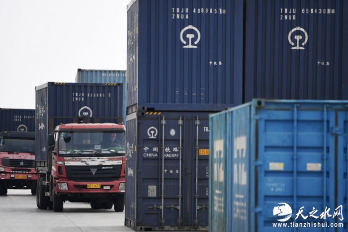 8月11日,货车在兰州新区中川北站物流园进行装卸作业。新华社记者 陈斌 摄