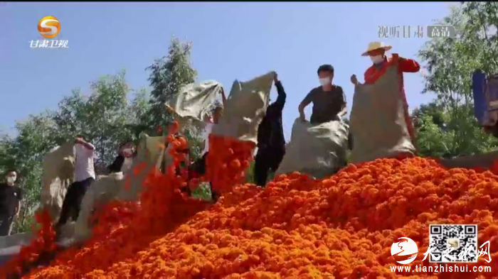 由于今年阳光、雨水充足,万寿菊长势良好,清水县丰望乡今年种植万寿菊2600余亩,乡政府组织13个经济合作社共同进行采收工作,合作社让附近的“三类户”就地就近采摘,按照每斤1.5元价格进行收购,按照当天采收情况来看,每人每天采摘600斤到800斤。