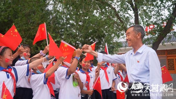 八步沙六老汉治沙纪念馆外,郭万刚与孩子们拉钩,约定每人都要来种3棵树。人民网 王文嘉摄