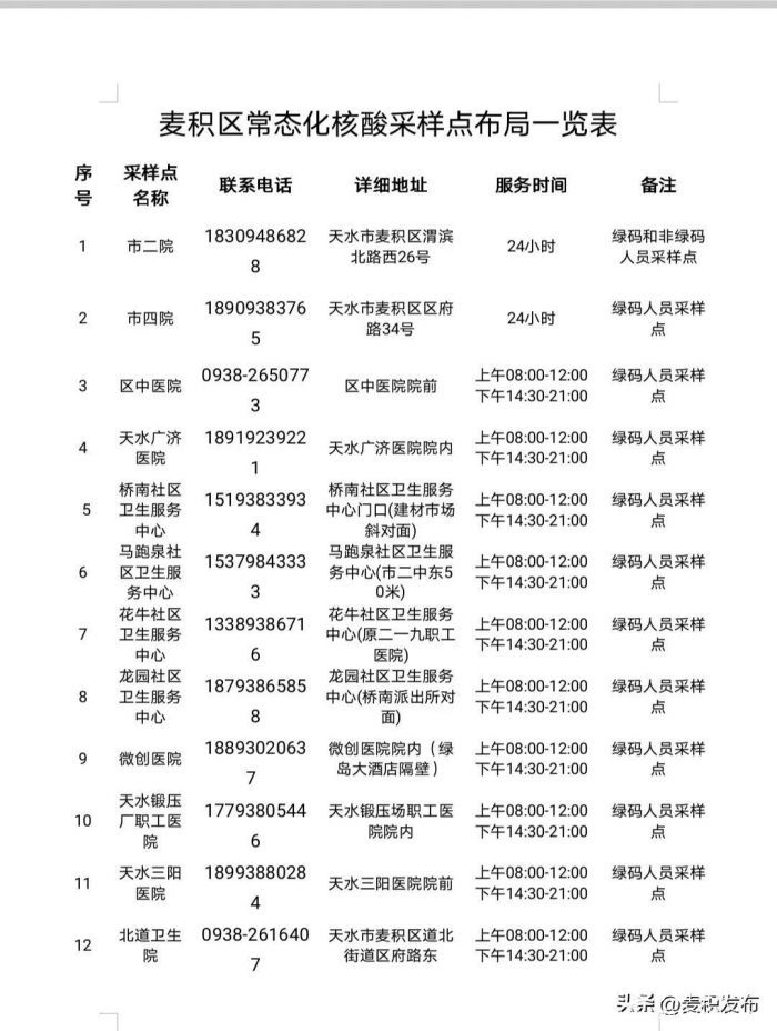 为充分发挥常态化疫情防控核酸检测筛查预警机制,有效防范疫情隐匿传播风险,切实做到早发现、早处置。根据《天水市麦积区强化常态化核酸检测及查验的实施方案》(麦疫防办发〔2022〕157号)精神,决定自8月12日起,按照常态化核酸检测原则上“一周全覆盖”的要求,对各类人群按风险高低开展1天1次到1周1次不同频次的定期核酸检测。现就有关事项公告如下: