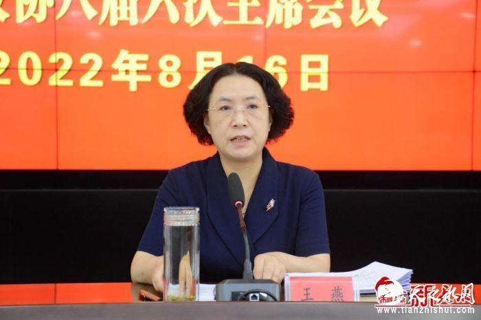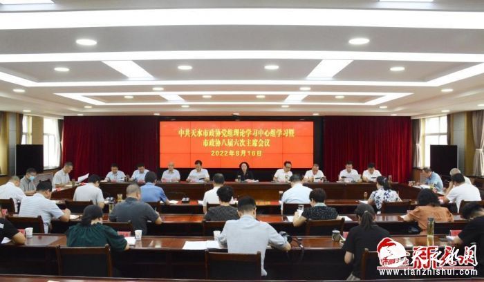 新天水讯【记者马哲】8月16日,天水市政协党组书记、主席王燕主持召开市政协党组理论学习中心组学习暨市政协八届六次主席会议。市政协党组副书记、副主席郭明兴,市政协党组成员、副主席马勤学、马筱宁,市政协副主席董仲奇、何宝平、杨铁森、罗增芳、范多智出席会议。